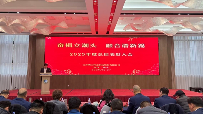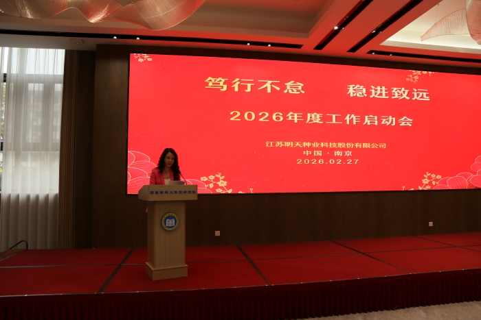2月27日,江蘇明天種業(yè)科技股份有限公司2025年度總結(jié)表彰暨2026年工作啟動大會在南京奧藝酒店蓮花廳隆重舉行。公司董事長胡玉萍、總經(jīng)理嚴(yán)輝民、總經(jīng)辦領(lǐng)導(dǎo)、各部門及子公司全體員工齊聚一堂,共同回顧過去一年的奮斗歷程,擘畫新一年的發(fā)展藍(lán)圖。