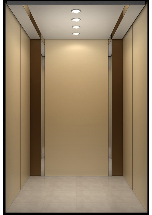轎廂型號(hào):YG-1622  天井:白色砂紋噴漆板(YG-05)+鏡面不銹鋼  兩側(cè)、后側(cè)板:兩側(cè)香檳色砂紋鋼板(YG-07),后側(cè)香檳色砂紋鋼板(YG-07)+深咖色砂紋烤漆板(YG-08)+鏡面飾條  前側(cè)板、門楣:緞紋不銹鋼  轎門:緞紋不銹鋼  地板:FL-P34(米黃PVC)  操作盤:BD-D2F1